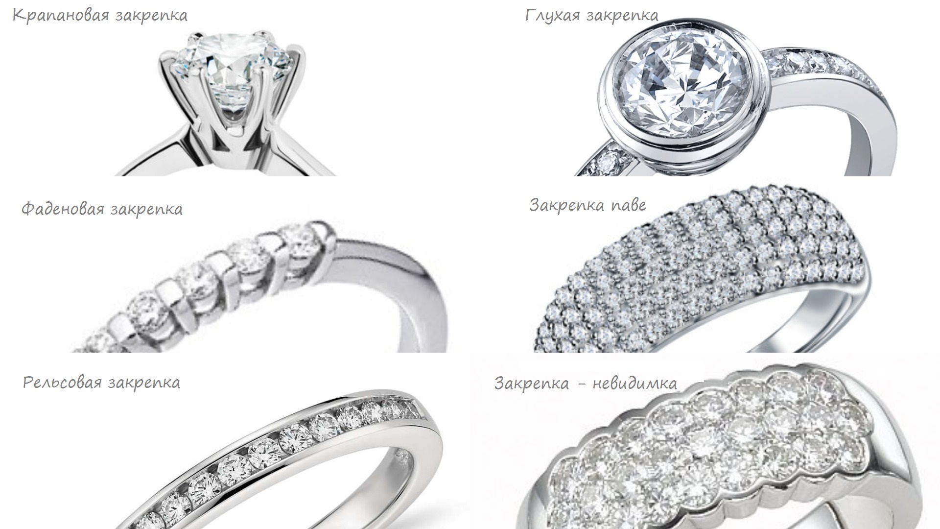 Рельсовая (канальная) закрепка подразумевает размещение камней одинакового размера, вплотную друг к другу, в ободок-рельс. При этом между камнями нет никаких металлических перегородок. Этот метод защищает камень с краев и обеспечивает свободный проход света сквозь него, что особенно подходит для прозрачных камней, таких как бриллианты.